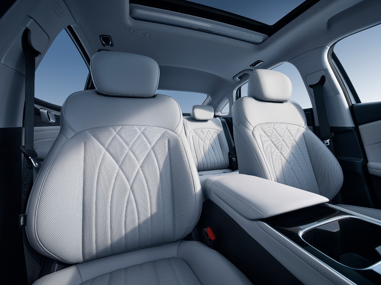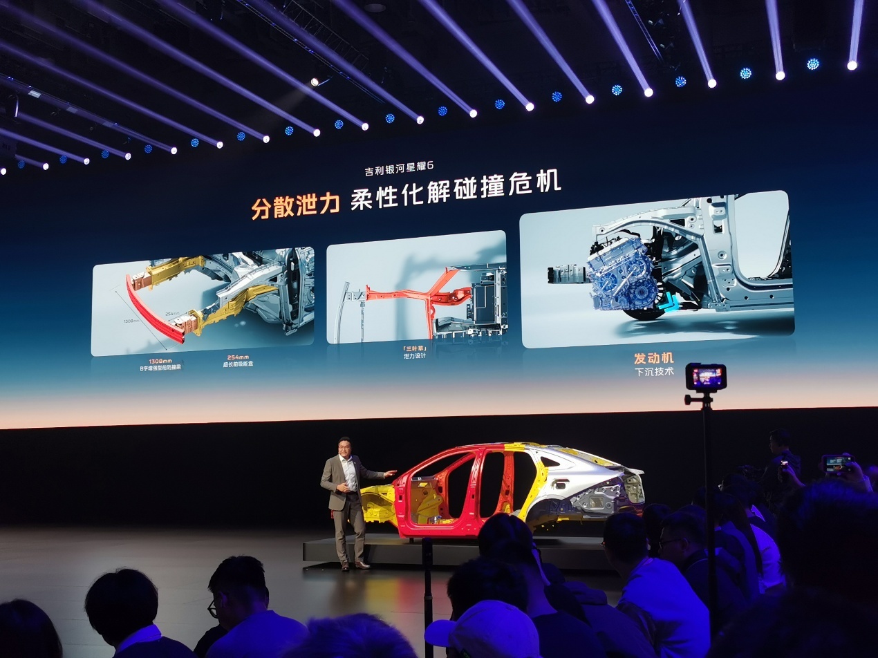 安全方面,新车基于GEA新能源架构打造,采用笼式车身设计,高强钢占比71.6%,拥有6横4纵的车身骨架、三叶草泄力结构及宽度1308mm的B字型前防撞梁。车辆标配6个安全气囊,包括前排双安全气囊、前排座椅侧安全气囊、前后排一体式双侧安全气帘。
