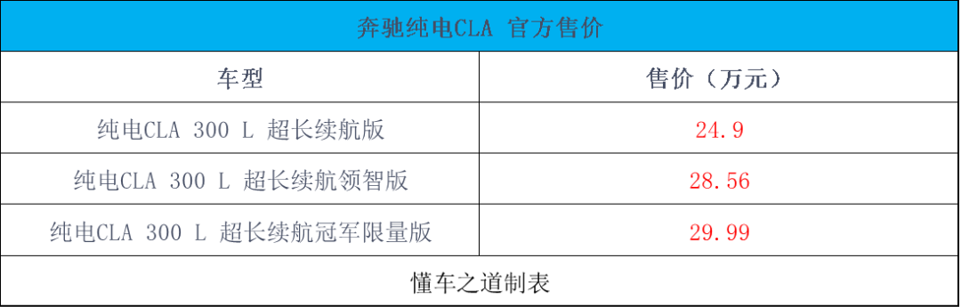 11月3日,奔驰全新纯电长轴距CLA正式上市,共推出3款配置,价格分别为24.9-29.99万元。主要配置差异在于城区领航辅助驾驶、14英寸副驾娱乐屏和AMG车身风格组件等。新车将搭载MB.OS架构与城区及高速领航辅助驾驶系统,并配备了两档变速箱和800V高压架构。