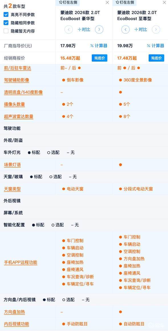 再来看2.0T的版本,两台车的售价分别为豪华型17.98万和至尊型19.98万,差价在2万元,除了动力相同之外,至尊型多出了19英寸轮毂、前驻车雷达、360度全景影像/540度透明底盘、分段式电动天窗、方向盘加热、前排手机无线充电、驾驶位座椅记忆、B&O音响系统以及车内氛围灯。