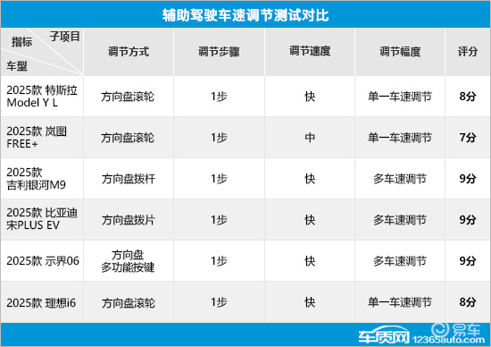 在辅助驾驶车速调节测试对比中,6款车型的整体表现基本符合预期。虽然调节方式存在差异,但在调节步骤方面均表现一致。需要指出的是,岚图FREE+调节速度略慢于其他车型。而在调节幅度方面,2025款特斯拉Model Y L(以下简称:特斯拉Model Y L)、岚图FREE+和理想i6不支持多车速调节,因此出现失分情况。