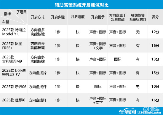 在辅助驾驶系统开启测试对比中,2025款示界06(以下简称:示界06)和2025款理想i6(以下简称:理想i6)采用方向盘拨杆开启,2025款比亚迪宋PLUS EV(以下简称:比亚迪宋PLUS EV)采用方向盘拨片开启,其余车型采用方向盘多功能按键开启。开启步骤方面,6款车型均只需1步,并且开启速度快,日常使用十分便捷。开启提示方面,2025款岚图FREE+(以下简称:岚图FREE+)和理想i6均提供三种提示方式,示界06仅提供一种提示方式,其余车型提供两种提示方式。此外,6款车型均配备方向盘离手监测提醒功能,除2025款吉利银河M9(以下简称:吉利银河M9)仅支持图标提醒外,其余车型都具备两种提醒方式。值得一提的是,岚图FREE+、吉利银河M9、比亚迪宋PLUS EV和理想i6还配备了辅助驾驶系统标志灯,能够为其他道路参与者提供明显提示。