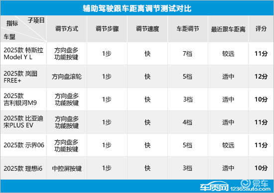 在辅助驾驶跟车距离调节测试对比中,岚图FREE+以满分成绩领跑,其不仅支持5档车距调节,并且最近跟车距离适中,整体表现出色。特斯拉Model Y L和示界06分别支持7档和5档车距调节,不过最近跟车距离较远,导致失分。相比之下,吉利银河M9和理想i6表现相对较差,只支持3档车距调节,在该项测试中排名靠后。