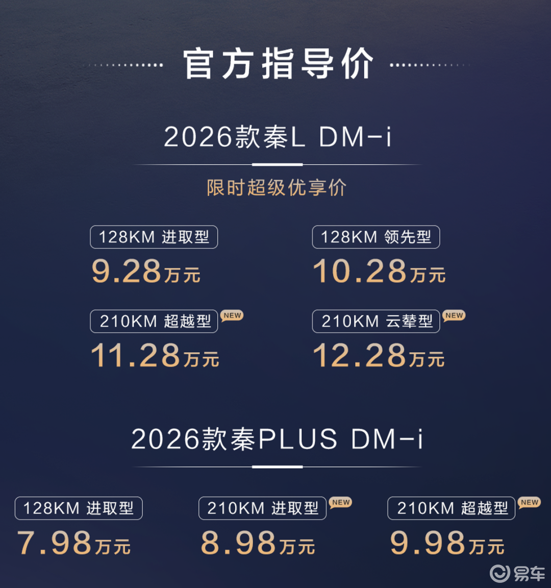 比亚迪在1月8日举办了秦家族长续航版发布会,推出了2026款秦L DM-i和秦PLUS DM-i。其中秦L DM-i提供128km和210km两种续航规格,对应的电池容量分别为15.87kWh和25.28kWh,全系标配快充,对应的起售价分别为9.28万和11.28万。秦PLUS DM-i同样提供两个续航规格,128km进取型售价7.98万,210km进取型和超越型售价分别为8.98万和9.98万,电池容量与秦L DM-i一致,同样标配快充。