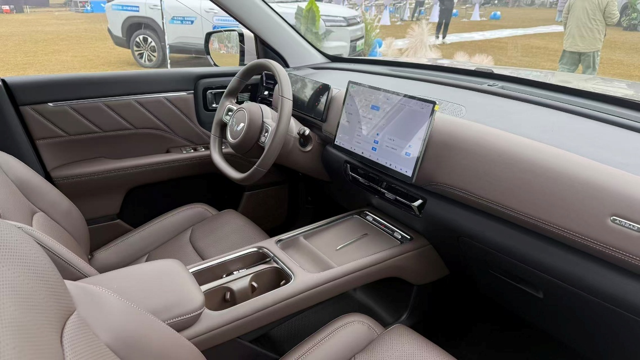 坐进车内,内饰的"实用导向"一目了然。中控台以实用的硬质材料为主,通过胡桃棕与暖沙棕的双色搭配,以及简单的银色饰条点缀,营造出远超价位的清爽感,完全没有廉价感可言。双辐式方向盘握感舒适,大小适中,纯电版专属的电子怀档设计尤为点睛,不仅操作便捷,更节省了中控台空间,让储物区域更规整。12.8英寸悬浮式中控屏操作流畅,搭载的Ling OS智能系统支持HiCar、CarLink等多平台互联,导航、音乐等高频功能一应俱全。