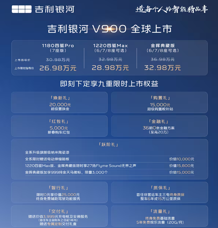 2026年1月20日,银河V900迎来正式上市。基础信息来看,该车共有3款配置车型可选,上市限时指导价为26.98-32.98万元,同时可享上市九重权益。从限时定价、上市权益来看,银河V900似乎备足了诚意,并有起量之意。