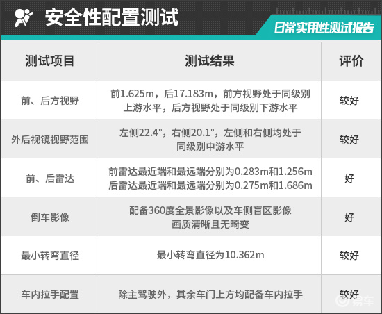 在车辆前、后方视野测试中,车内所有座椅均已调整至最低状态,所测出的数据与驾驶者正常使用时均有一些偏差,仅供参考。