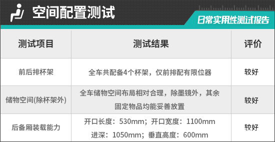 对于车内使用空间的测试,只针对前排触手可及的空间,不包括手套箱、中央扶手箱等需开启的空间。测试方法是将以下固定物品全部放置在前排的各个储物空间内,通过固定物品的放置情况来判断车辆储物空间的表现。测试选定的固定物品为:2瓶常规大小的矿泉水、1部大屏手机、1支口红、1个挎包、1副墨镜、1把折叠雨伞以及1包常规尺寸的抽纸。
