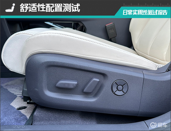 舒适性配置方面,评测车的前排座椅调节按键分别位于座椅左右两侧,位置合理且操作便捷。同时,前排座椅配备3组电动座椅记忆、加热以及通风功能,驾驶位座椅还配备按摩功能,整体舒适性表现可圈可点。