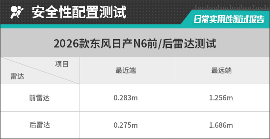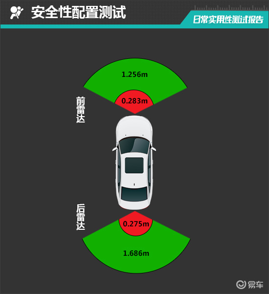 在测试过程中,倒车雷达在1.686m处可感应到后方物体,雷达功率表现可圈可点,从实测数据来看,评测车的倒车雷达最近端提示距离为0.275m,达到同级别平均水平。
