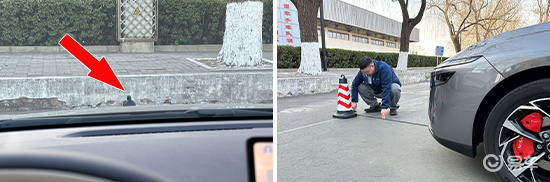 在前方视野测试中,我们采用高70cm的桩桶作为参照物,随后调整车距,直至在主驾驶位可以看到桩桶上沿。经过测试,桩桶与车头最终测得的数据为1.625m,在测试过的同级别车型中处于上游水平。