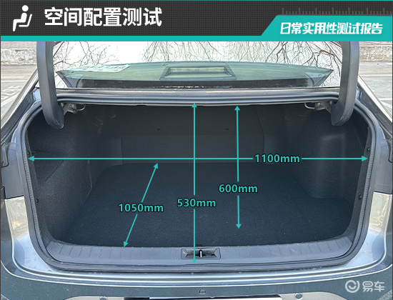 后备厢内部空间较为规整,常规状态下容积为570L,能够满足大件行李物品的装载需求。不过,后排座椅靠背不支持放倒,无法进一步拓展储物空间。对于评测车后备厢的基础数值,我们也进行了实测,开口长度为530mm;开口宽度为1100mm;后备厢进深为1050mm;后备厢地台与顶部的垂直高度为600mm。