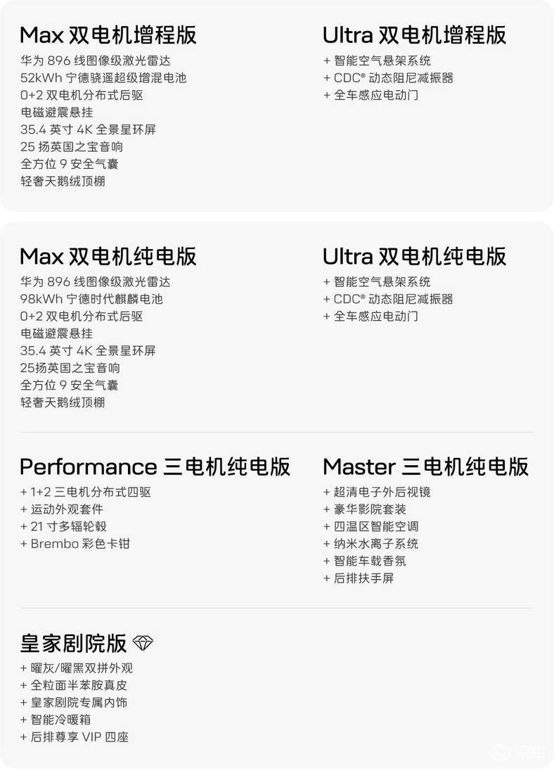 智能驾驶系统上,老款搭载华为乾崑ADS4.0,城区领航为选装;太行电驱还赋能极致安全,可完成220km/h高速爆胎稳停、92.29km/h雪面双移线等老款无法实现的极限测试。被动安全上,新车型新增前排中间气囊,纯电版电池底部增加高强度钢防护,抗撞击能力超国标 10 倍,老款则无此配置。