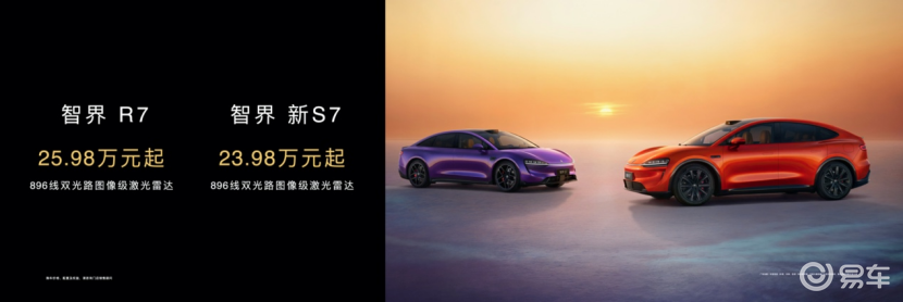 智界R7 896线双光路图像级激光雷达配置,官方建议零售价25.98万元起;智界新S7 896线双光路图像级激光雷达配置,官方建议零售价23.98万元起。2026年5月7日前下定,智界R7可享至高64,000元限时购车权益,智界新S7可享至高74,000元限时购车权益。现已经开启全国交付。