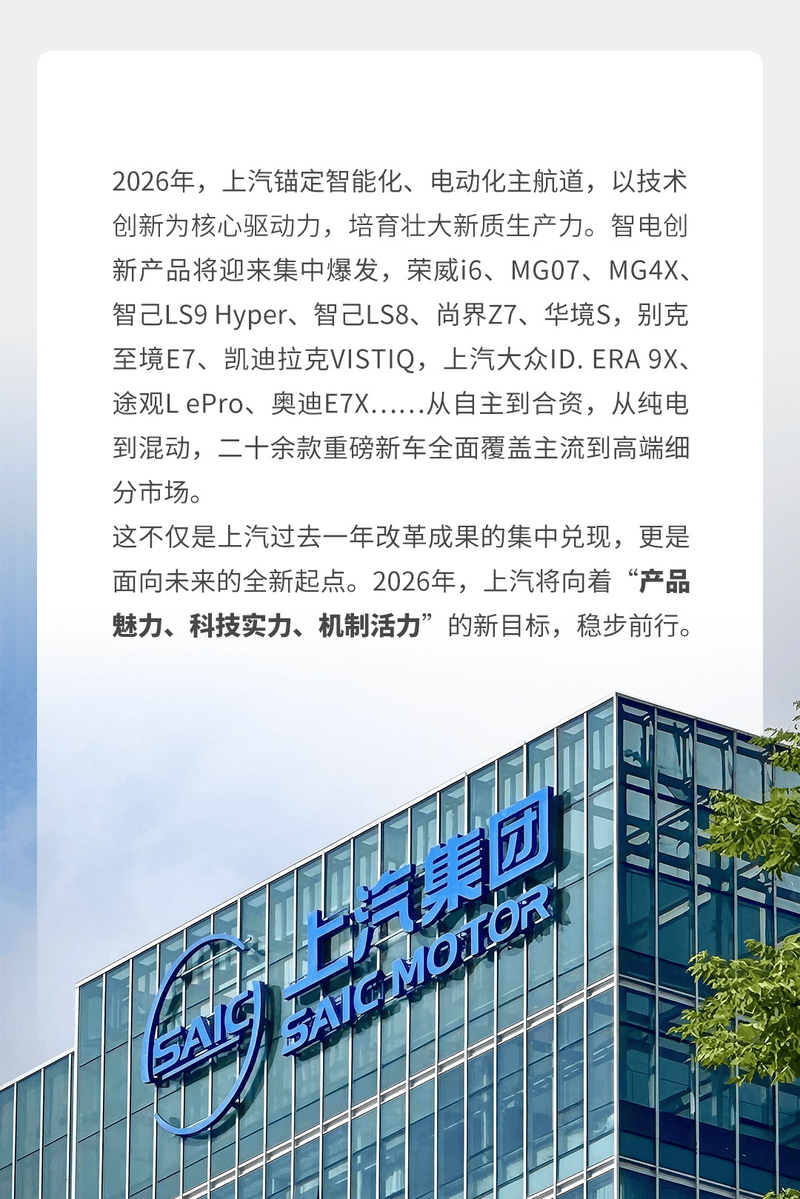 2026年,上汽锚定智能化、电动化主航道,以技术创新为核心驱动力,培育壮大新质生产力。智电创新产品将迎来集中爆发,荣威i6、MG07、MG4X、智己LS9 Hyper、智己LS8、尚界Z7、华境S,别克至境E7、凯迪拉克VISTIQ,上汽大众ID. ERA 9X、途观L ePro、奥迪E7X二十余款重磅新车全面覆盖主流到高端细分市场。